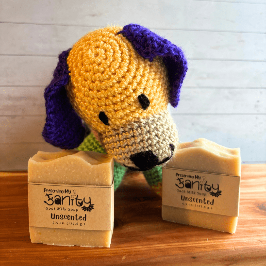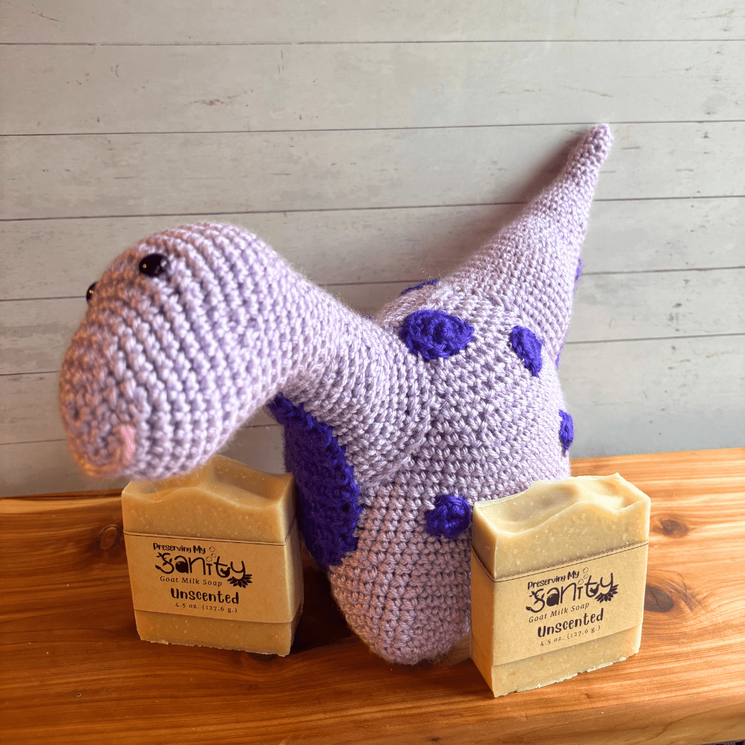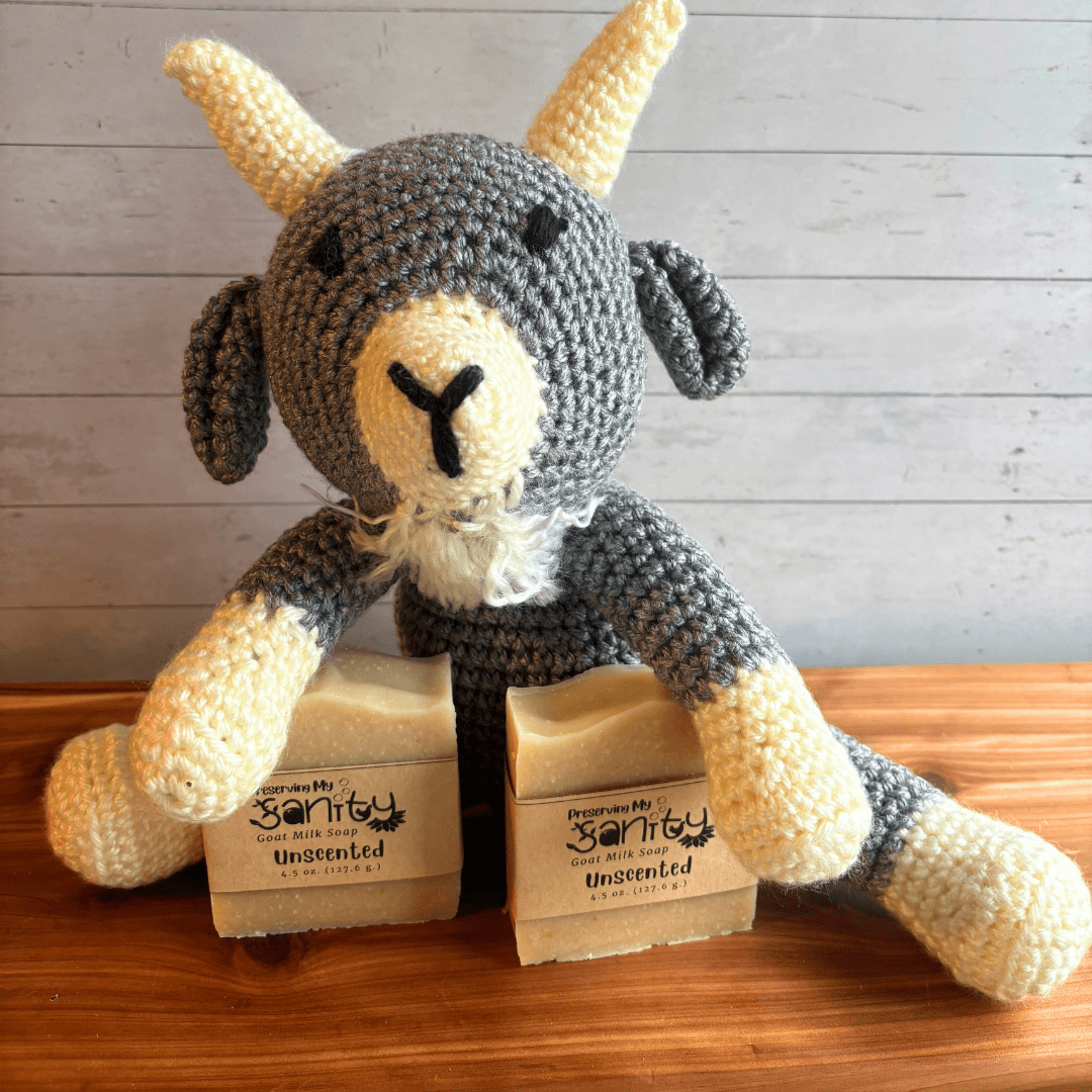 (Price listed is for one gift set of a crocheted animal stuffy of your choice and 2 bars of unscented goat milk soap = 3 total pieces.)