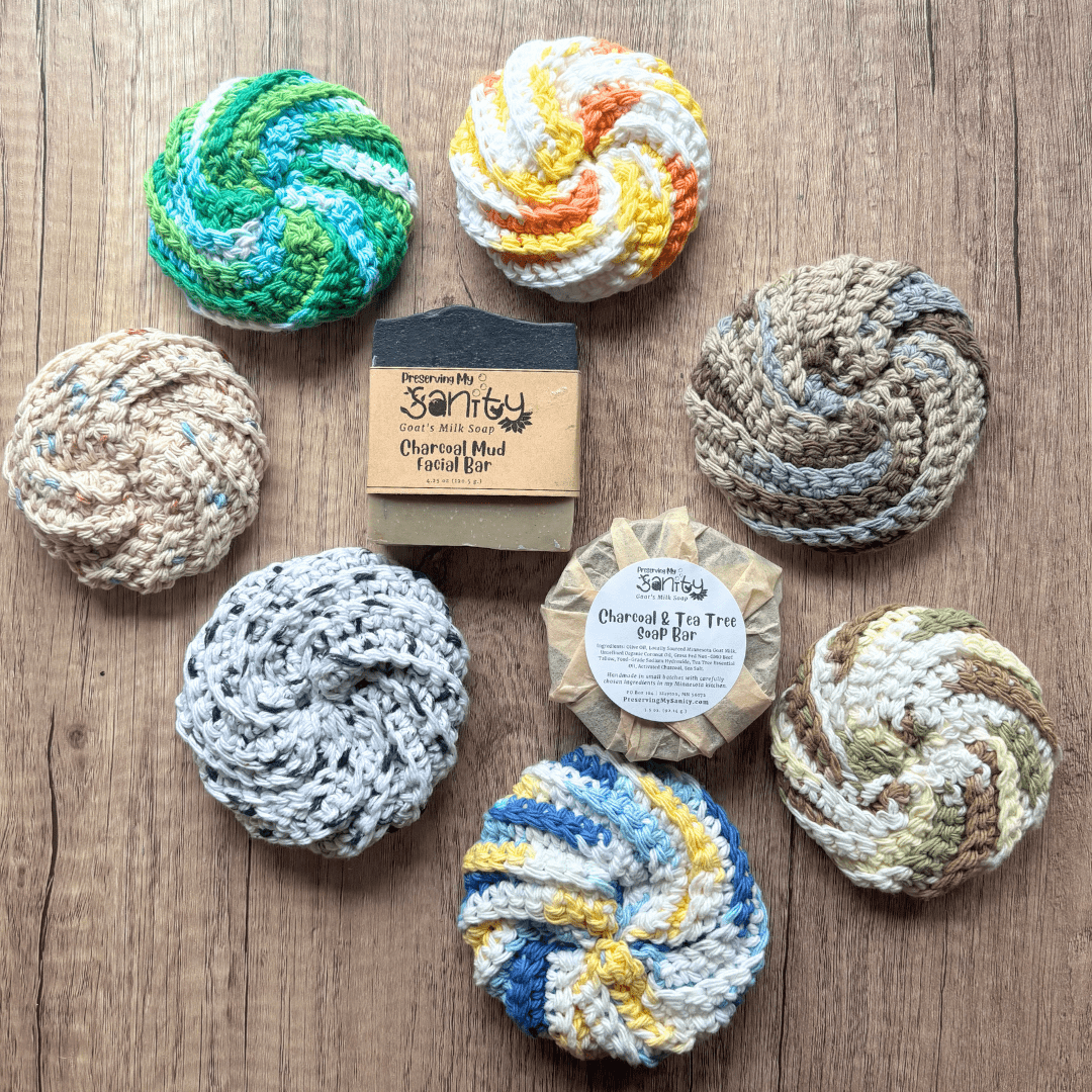 They are approximately 4″ in diameter (exact size varies a bit due to handmade nature of product) and crocheted in double-thickness. They make a great accessory to your handcrafted goat’s milk soap, and a fun add-on to a build-your-own gift bundle.