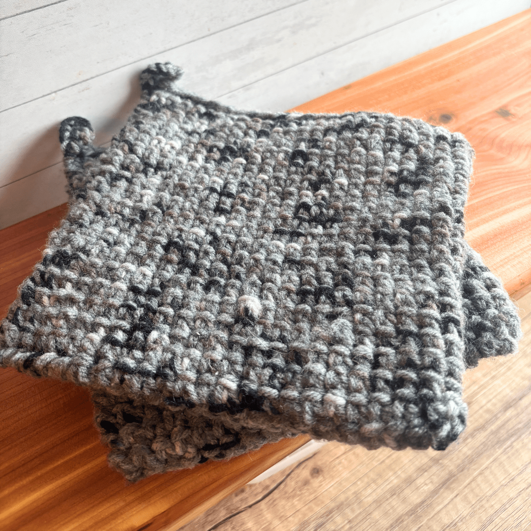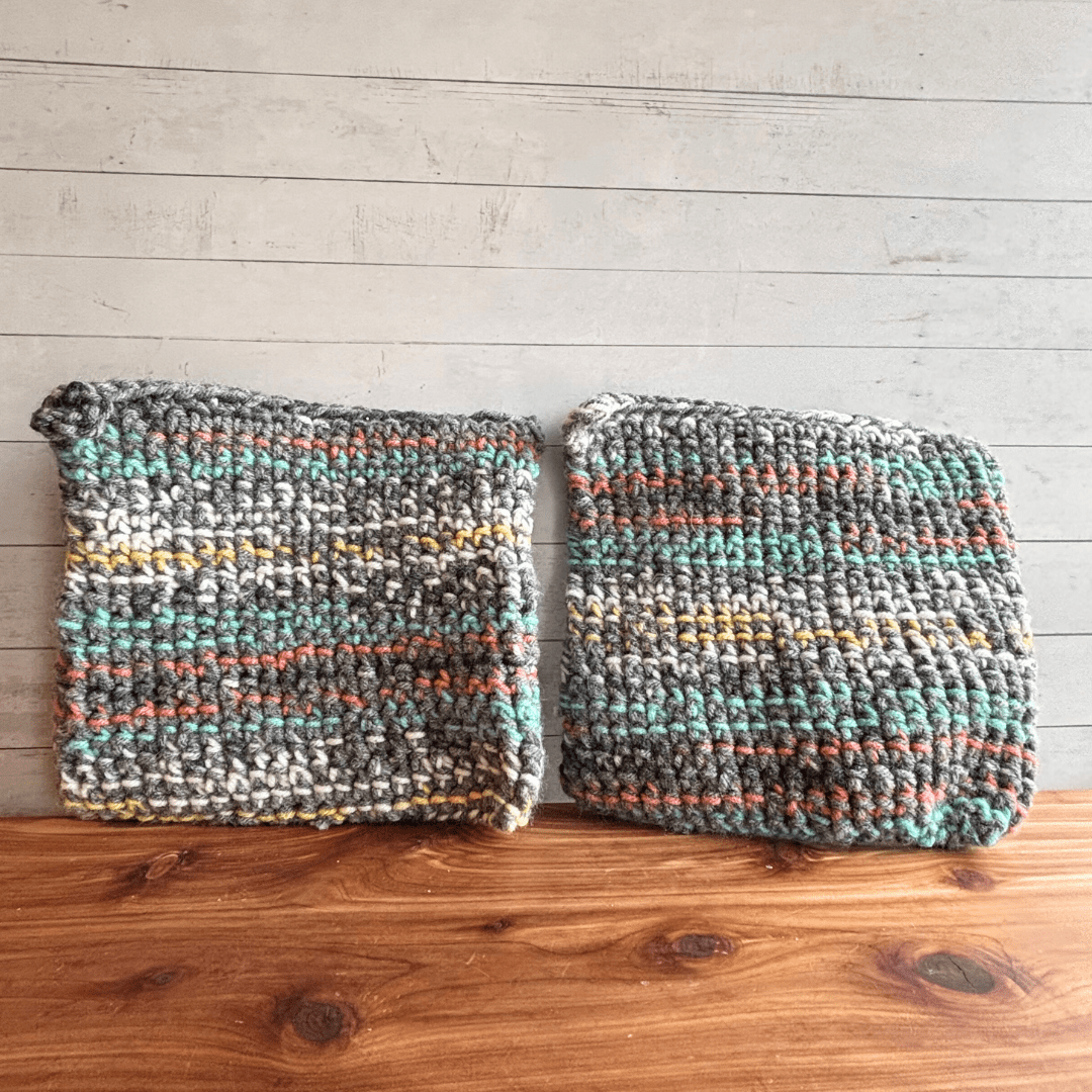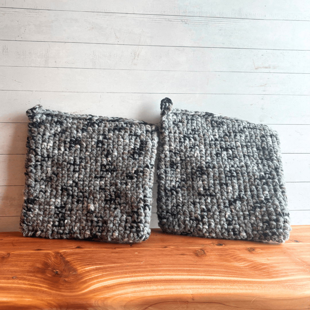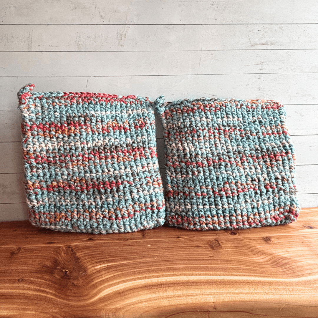 They are crocheted with two strands of acrylic yarn in a double thickness pattern, which I find especially perfect for taking cast iron skillets out of the oven. You can also use them as hot pads. I also stitch a small loop into one corner of each, so you can hang them on a hook if you choose.