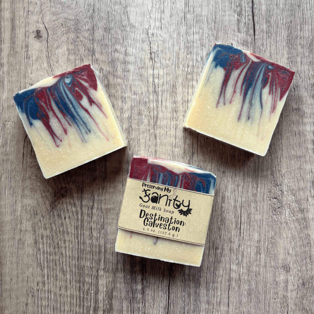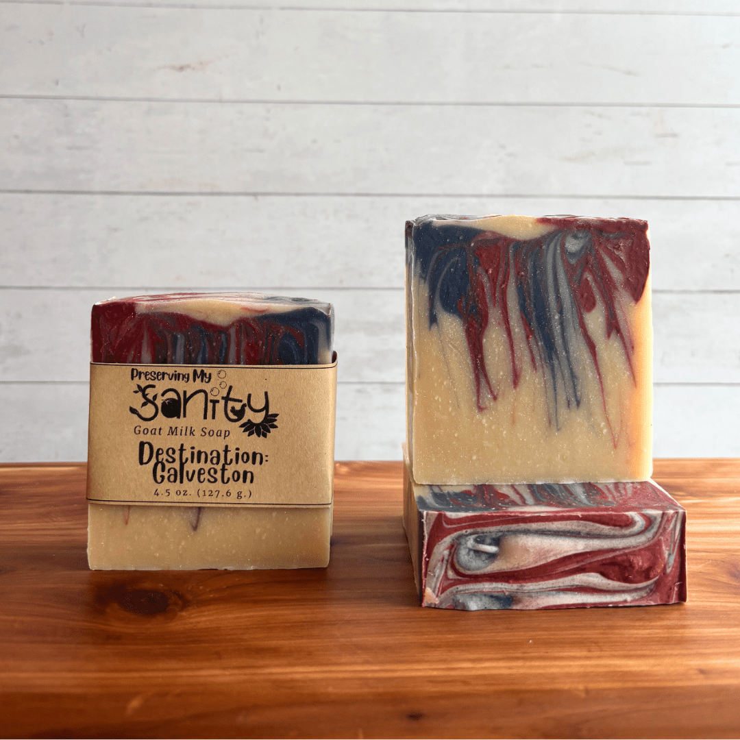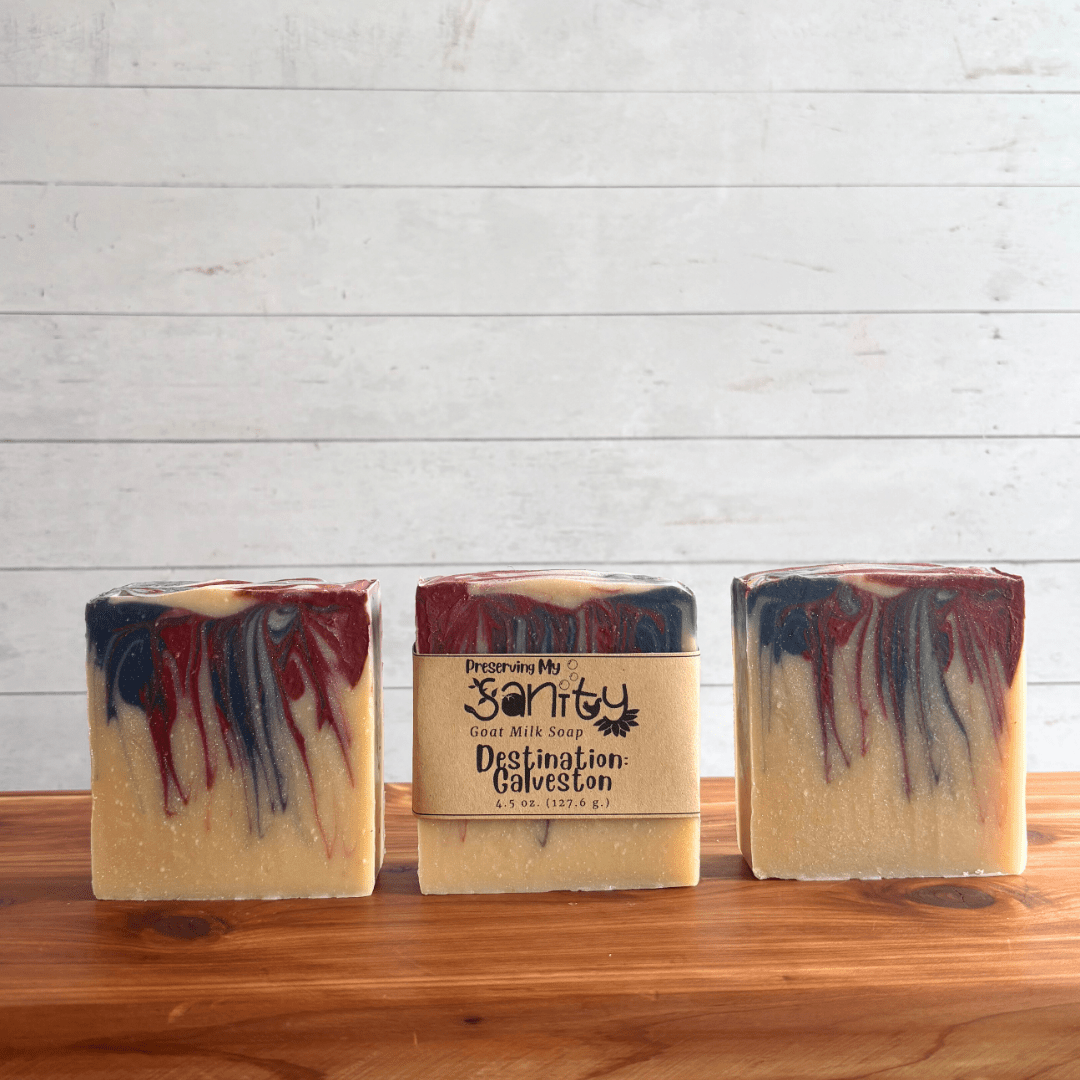 Handmade in small batches in my Minnesota kitchen, this Destination: Galveston soap contains: Olive Oil, Locally Sourced Minnesota Goat Milk, Beer, Unrefined Organic Coconut Oil, RSPO Certified Sustainable Palm Oil, Food-Grade Sodium Hydroxide, Castor Oil, Fragrance Oil (Paraben & Phthalate Free), Sunflower Oil, Mica, Oxide.