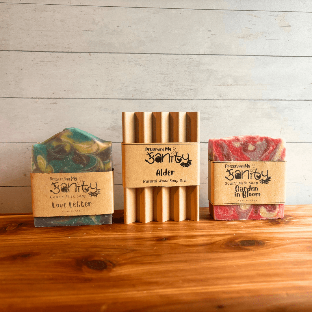 - Pair a full-size or half-size bar of soap with a soap bag or soap dish for a small gift or fill a reclaimed wood tray or box for a larger one.
