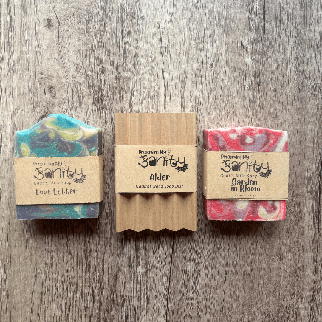 (Price listed is for two bars of goat milk soap and a natural wood soap dish = 3 pieces + a gold organza bag.)