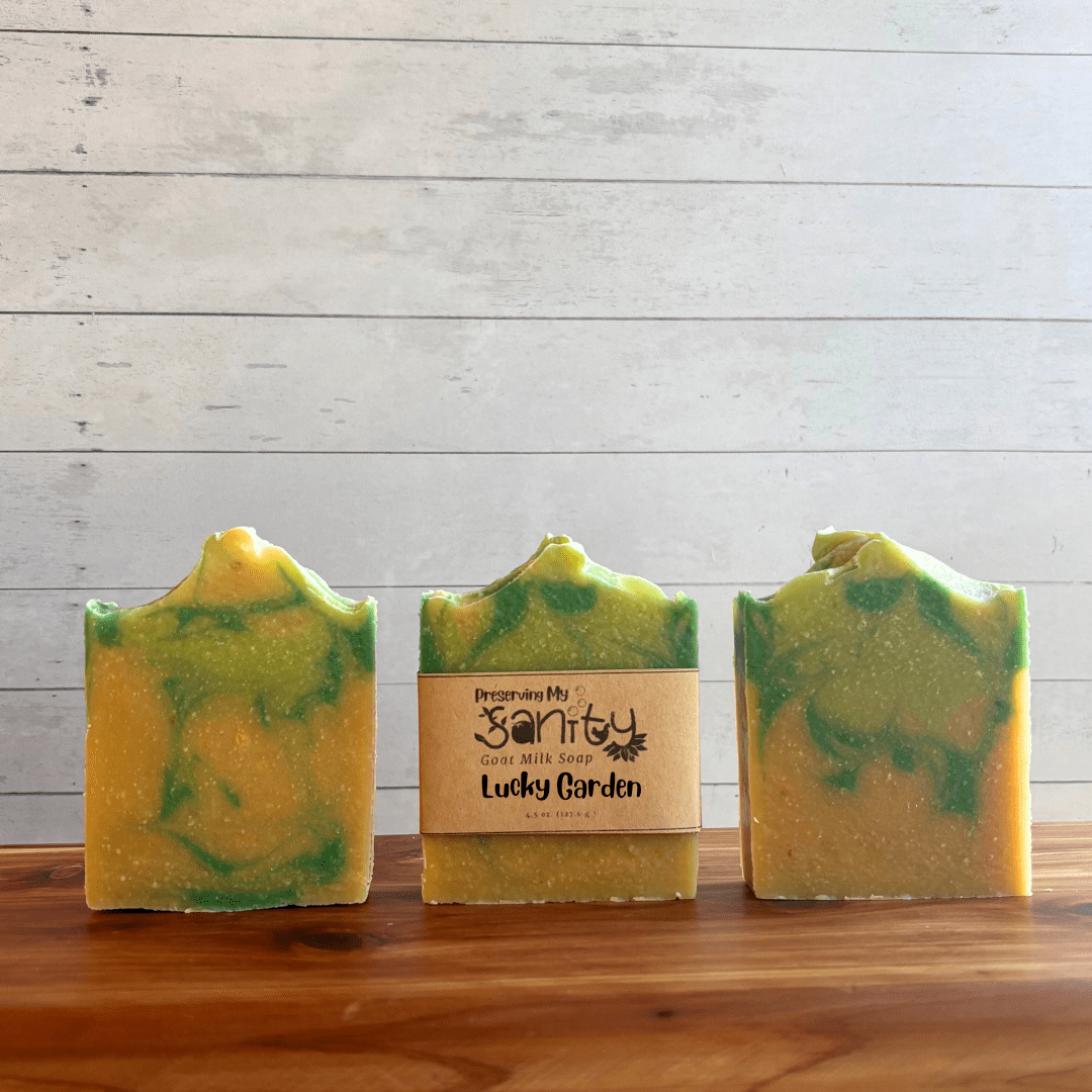 Handmade in small batches in my Minnesota kitchen, this Lucky Garden soap contains Olive Oil, Locally Sourced Minnesota Goat Milk, Unrefined Organic Coconut Oil, RSPO Certified Sustainable Palm Oil, Food-Grade Sodium Hydroxide, Castor Oil, Fragrance Oil (Paraben & Phthalate Free), Sunflower Oil, Mica.