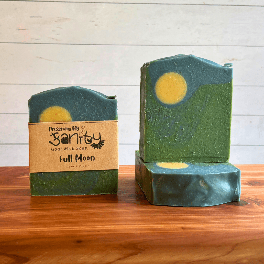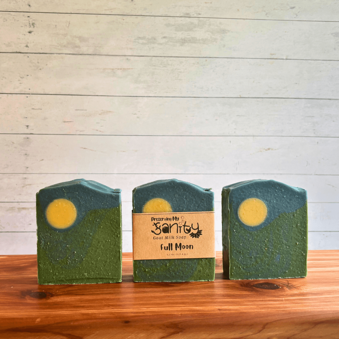Handmade in small batches in my Minnesota kitchen, this Full Moon soap contains Olive Oil, Locally Sourced Minnesota Goat’s Milk, Unrefined Organic Coconut Oil, RSPO Certified Sustainable Palm Oil, Food-Grade Sodium Hydroxide, Castor Oil, Fragrance Oil (Paraben & Phthalate Free), Sunflower Oil, Oxide, Mica.