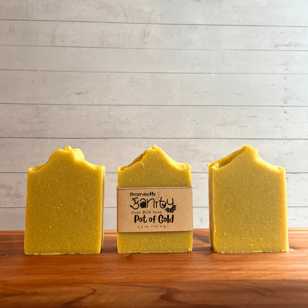 Handmade in small batches in my Minnesota kitchen, this Pot of Gold soap contains: Olive Oil, Locally Sourced Minnesota Goat’s Milk, Unrefined Organic Coconut Oil, RSPO Certified Sustainable Palm Oil, Food-Grade Sodium Hydroxide, Castor Oil, Fragrance Oil (Paraben & Phthalate Free), Sunflower Oil, Mica, Pumice Powder.