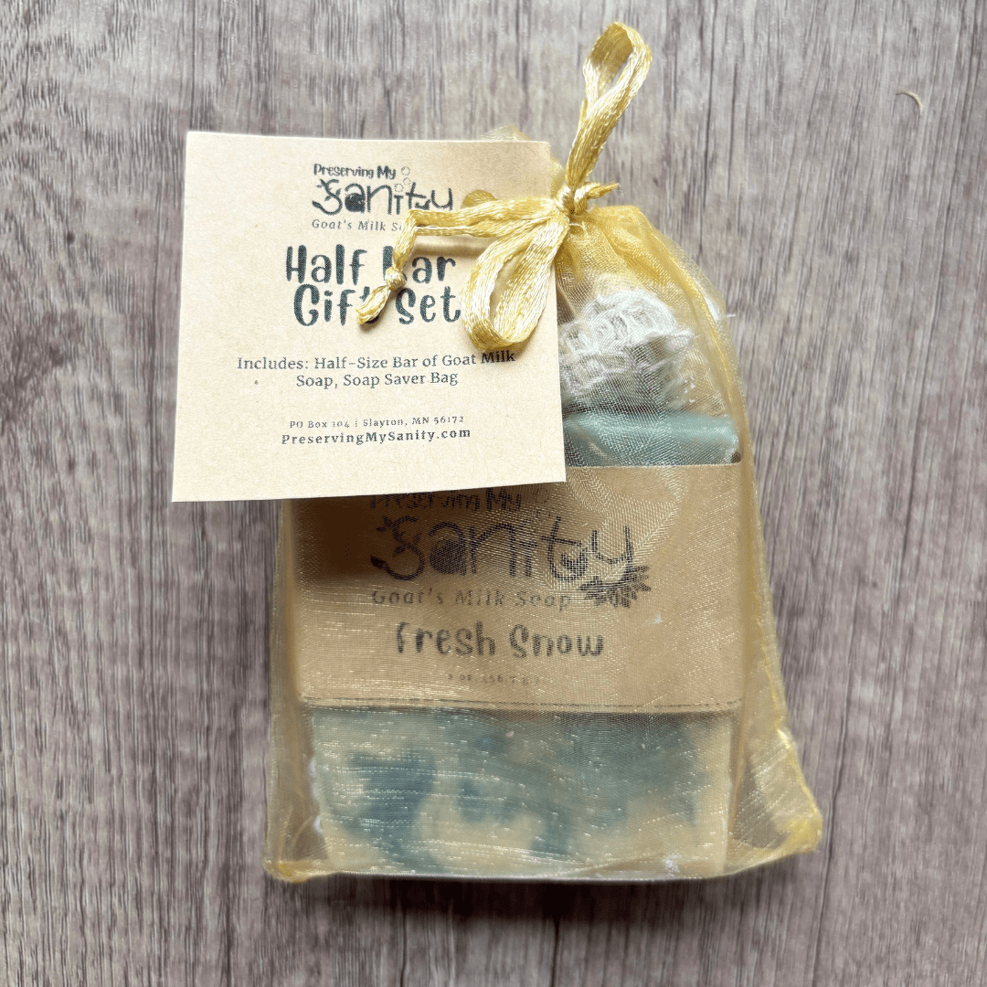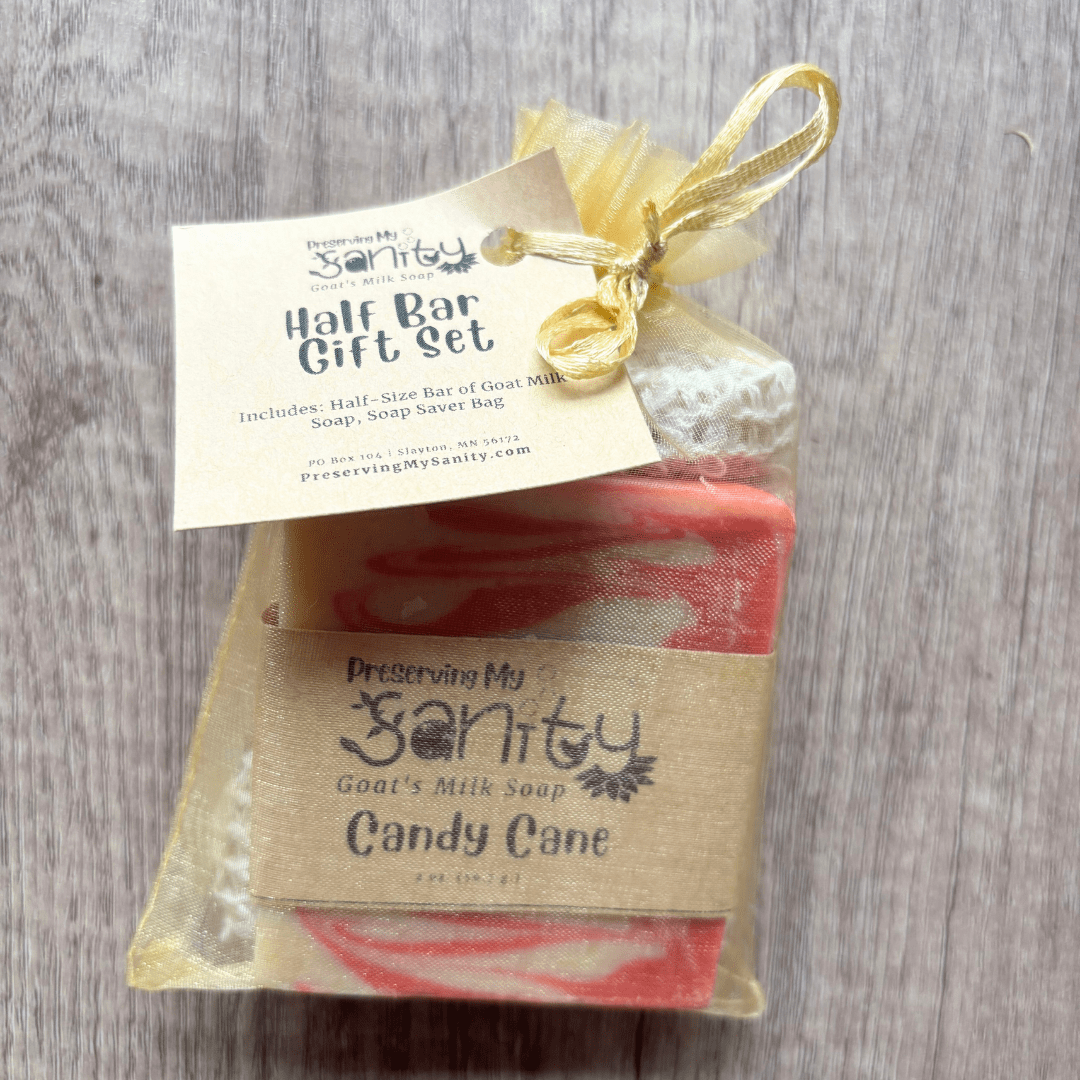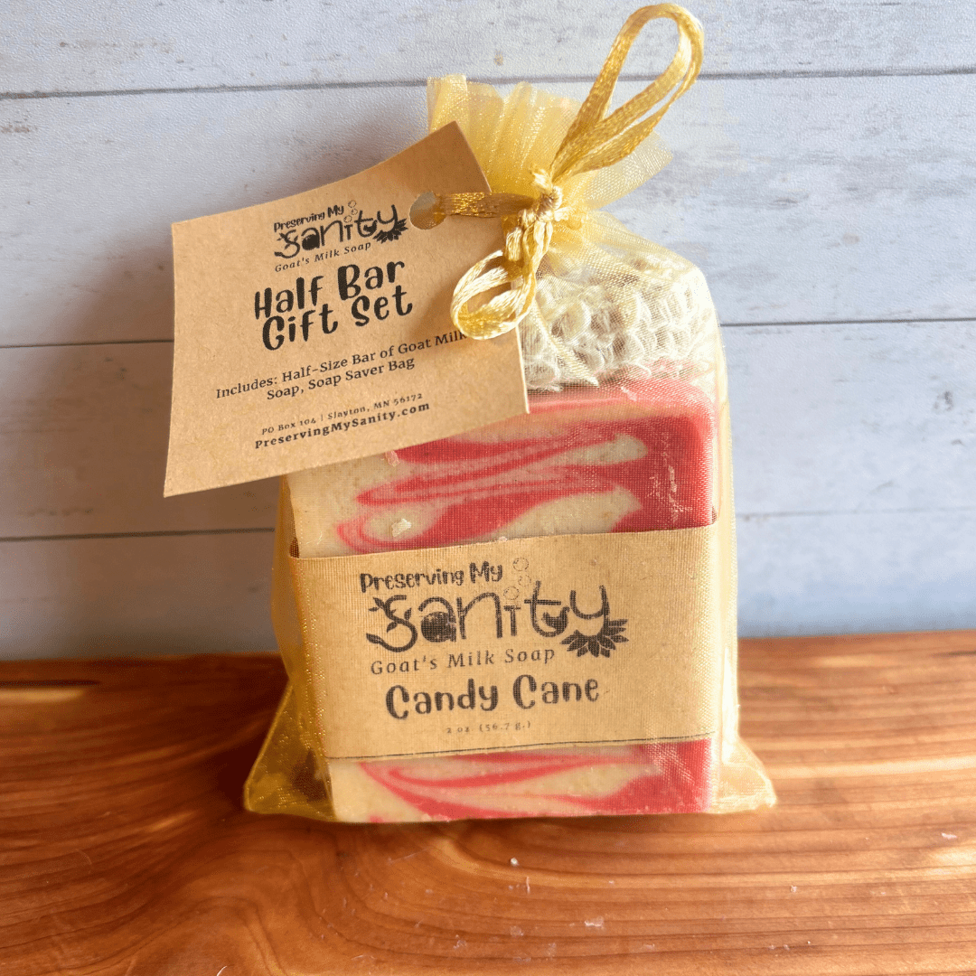 Handmade in small batches in my Minnesota kitchen, this Holiday Scents Half-Size Soap Bar Gift Set contains a half-size soap bar of your choice and a reusable sisal soap saver bag.