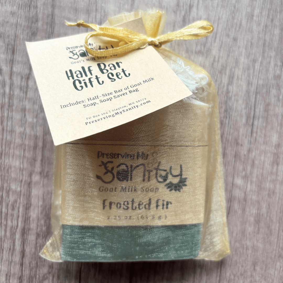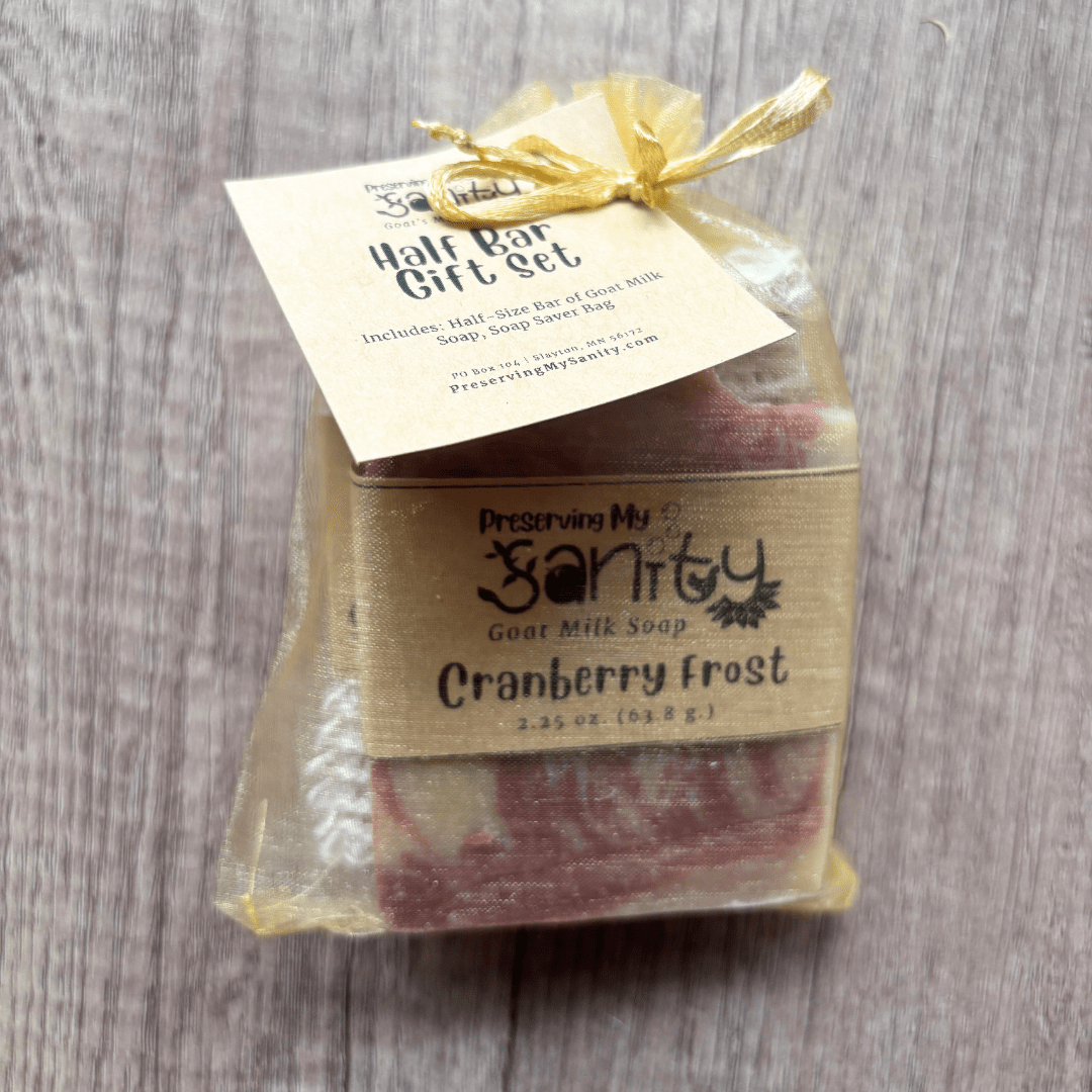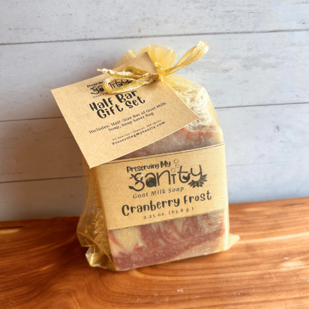 Handmade in small batches in my Minnesota kitchen, this Holiday Scents Half-Size Soap Bar Gift Set contains a half-size soap bar of your choice and a reusable sisal soap saver bag.