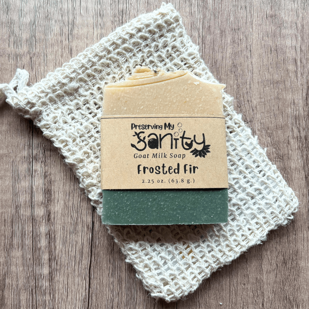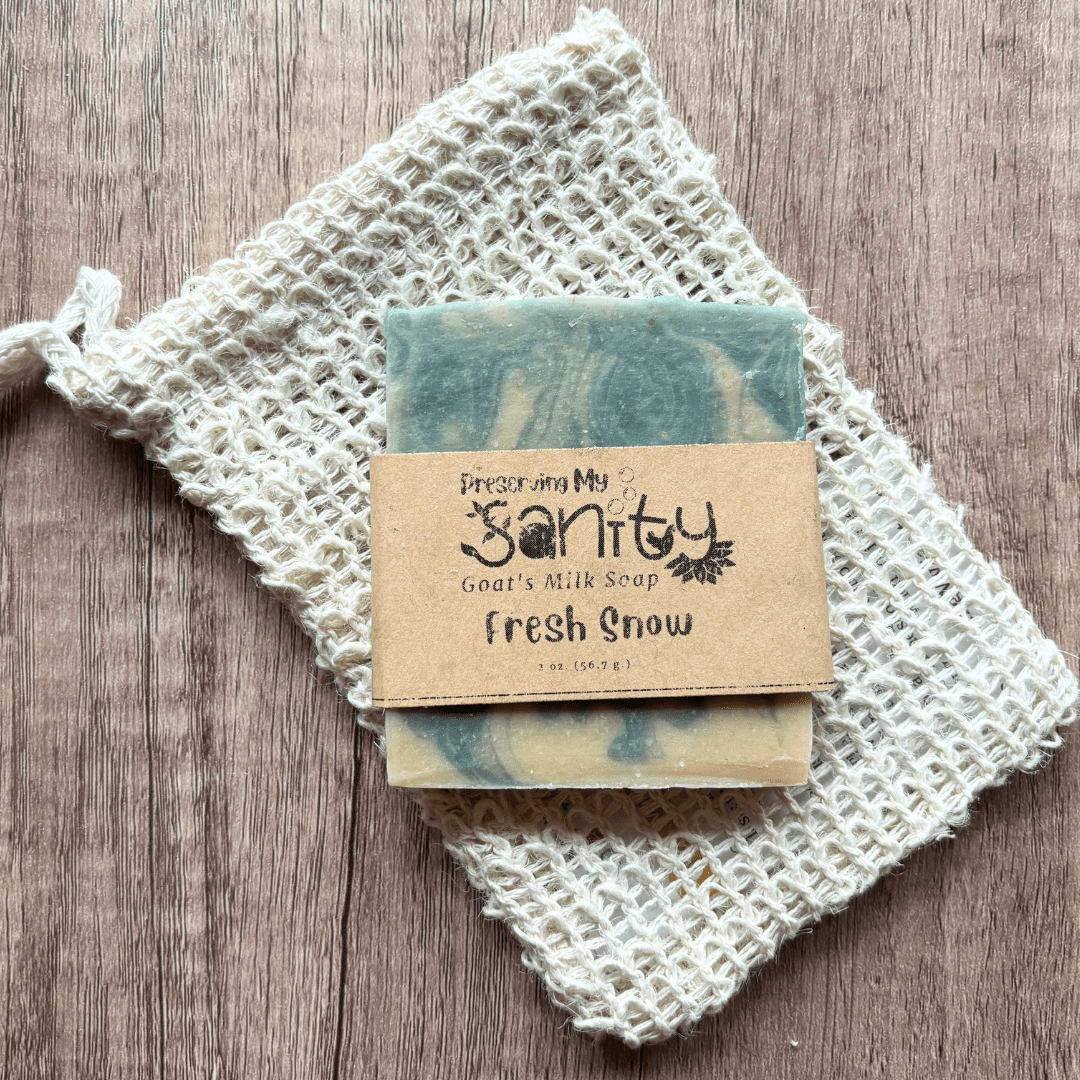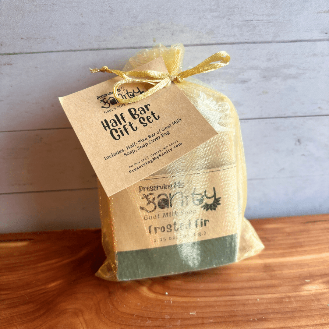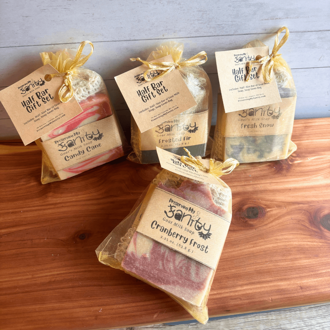 (Price listed is for one half-size (2.25-ounce) bar of goat milk soap in the scent of your choice and a sisal soap saver bag = 2 total pieces + a gold organza gift bag.)