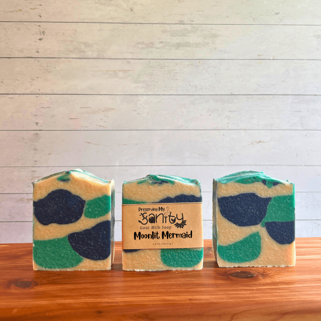 Handmade in small batches in my Minnesota kitchen, this Moonlit Mermaid soap contains Olive Oil, Locally Sourced Minnesota Goat’s Milk, Unrefined Organic Coconut Oil, RSPO Certified Sustainable Palm Oil, Food-Grade Sodium Hydroxide, Castor Oil, Fragrance Oil (Paraben & Phthalate Free), Sunflower Oil, Mica.