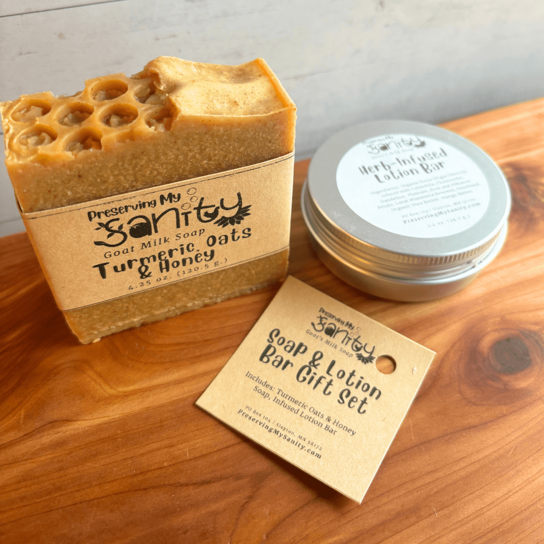 Soap ingredients include: Olive Oil, Locally Sourced Minnesota Goat Milk, Unrefined Organic Coconut Oil, RSPO Certified Sustainable Palm Oil, Organic Unrefined Shea Butter, Food-Grade Sodium Hydroxide, Colloidal Oatmeal, Turmeric, and Local Honey.
