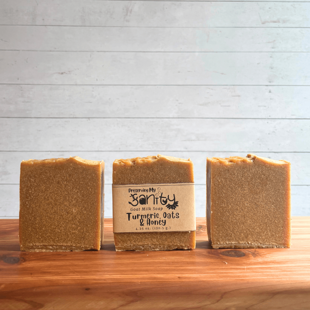 Handmade in small batches in my Minnesota kitchen, this Turmeric, Oats & Honey soap contains: Olive Oil, Locally Sourced Minnesota Goat Milk, Unrefined Organic Coconut Oil, RSPO Certified Sustainable Palm Oil, Organic Unrefined Shea Butter, Food-Grade Sodium Hydroxide, Colloidal Oatmeal, Turmeric, and Local Honey.