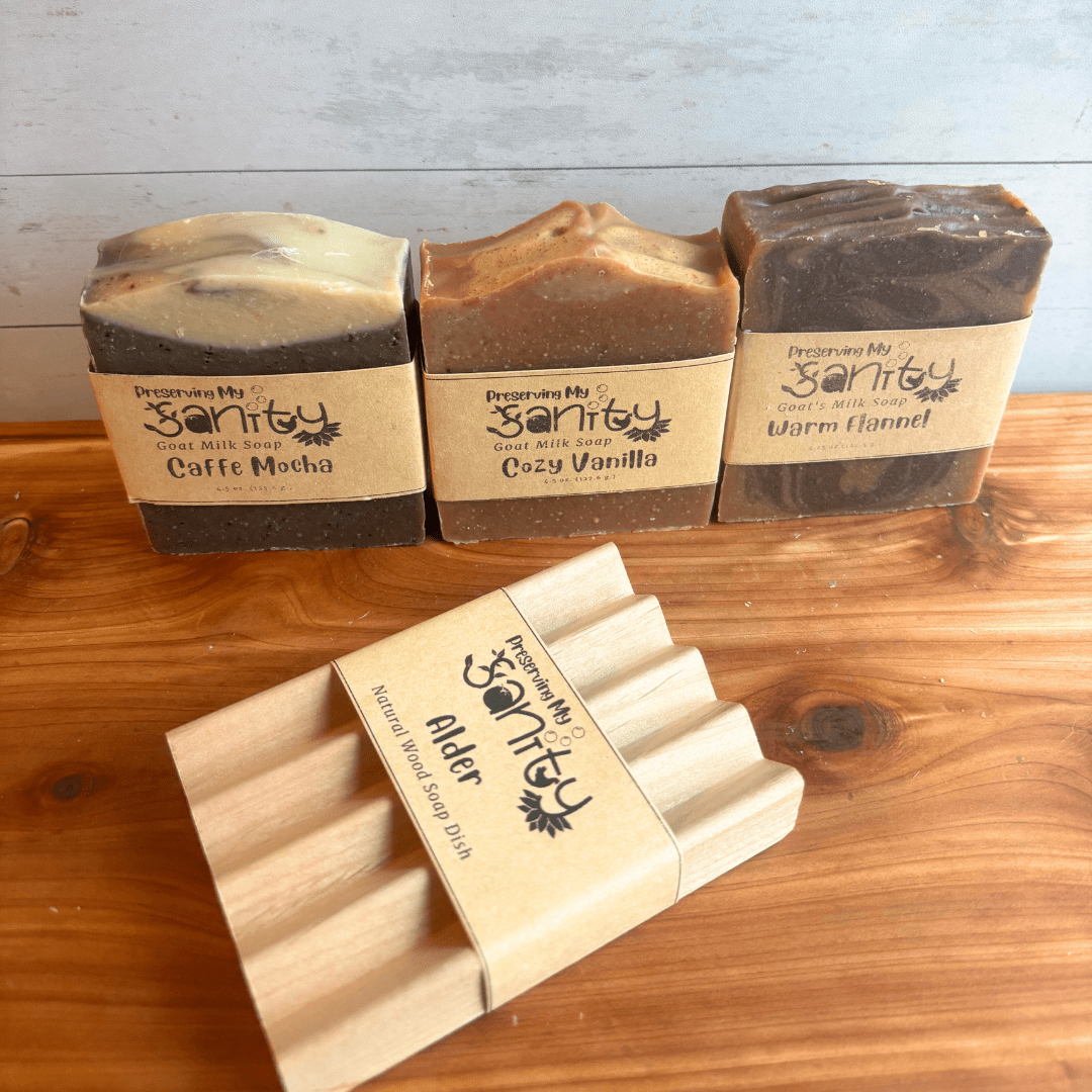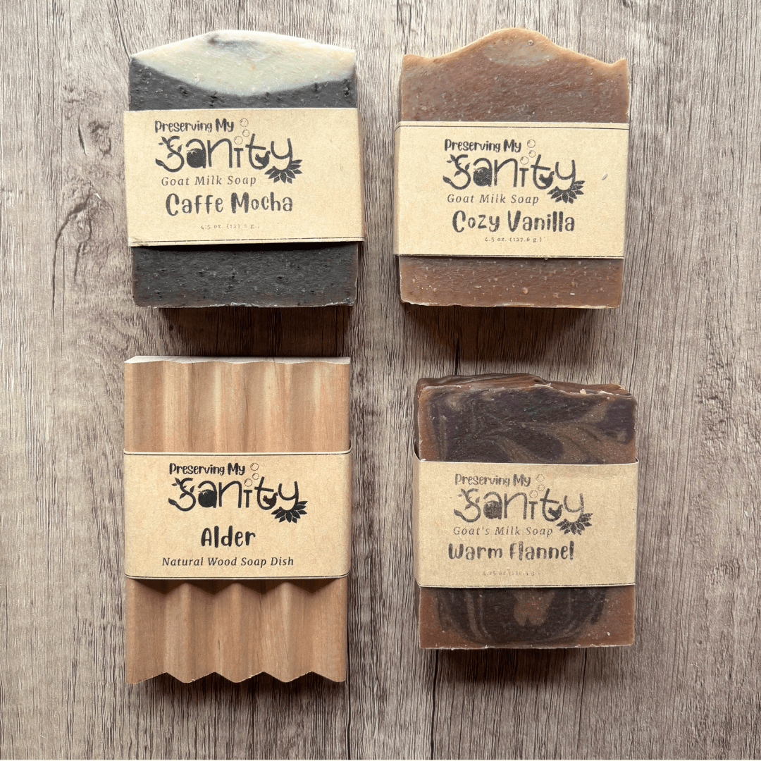 Soap ingredients include: Olive Oil, Locally Sourced Minnesota Goat’s Milk, Unrefined Organic Coconut Oil, RSPO Certified Sustainable Palm Oil, Food-Grade Sodium Hydroxide, Castor Oil, Fragrance Oil (Paraben & Phthalate Free), Sunflower Oil, Mica. Caffe Mocha also contains Brewed Coffee, Coffee Grounds, and Activated Charcoal.